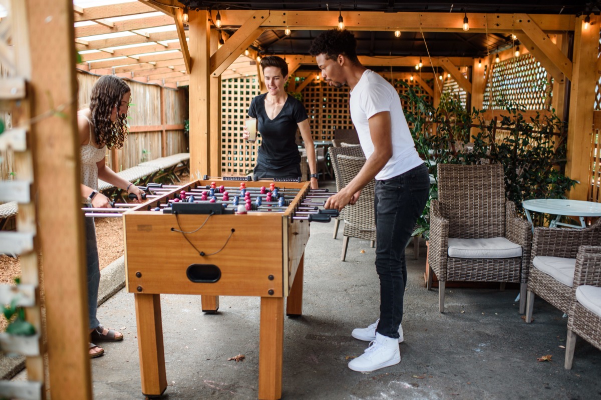 At Common Fields, you’ll find a lively outdoor hub where games and good company collide. Games take place in the courtyard, which includes a kid-friendly play space, and the venue hosts trivia nights and other entertainment that draw adults and families alike. The food trucks are a standout feature, each custom-built to look like a tiny house. Pair that with local craft beverages, and you have a welcoming, communal hangout where you can settle in, roll the dice, and let the laughter spill into the courtyard.